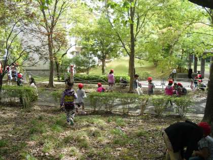生活の時間に、新林池公園に、秋をさがしに出かけました。葉も夏のころとは違って赤や黄色に色づき、たくさんの実もできていました。かえでの葉を上から落とすとクルクルとプロペラのようにまわって落ちるのを楽しみました。どんぐりや木の実をポケットいっぱいに集めて持ち帰りました。