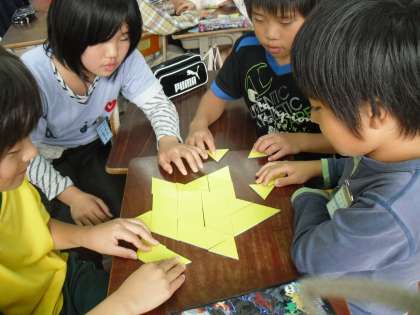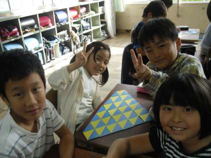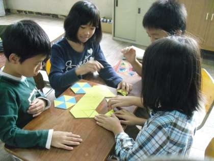 算数では三角形の学習をしています。二等辺三角形や正三角形をしきつめてきれいな模様を作ったり、組み合わせて楽しい形を作りました。
