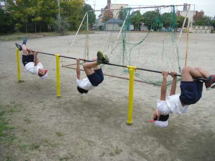 はじめは、「ぶたのまるやき」や「こうもり」など、ぶらさがる技に挑戦しました。