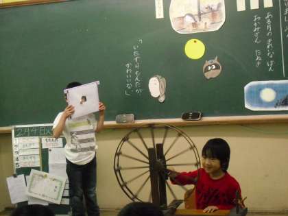 やぶれ障子の穴から、2つのくりくりした目玉がのぞく様子を、おかみさんが糸車をまわしながら「かわいいな。」といっている場面の学習をしました。