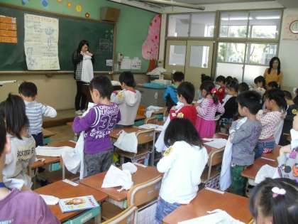 食の学習で、栄養教諭の吉谷先生におもしろいエプロンのたたみ方を教えてもらいました。歌を歌いながら、あらま、あっというまにきれいにたためました。