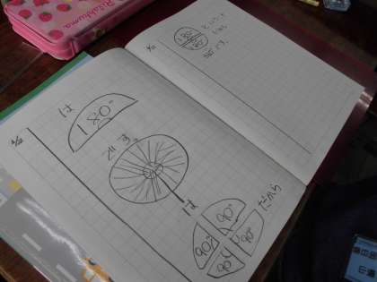 算数では「角とその大きさ」の学習をしています。今日は「おうぎを開いたとき,半回転や一回転してできる角の大きさを調べましょう。」という問題でした。一人ひとり,先日作ったおうぎをもとに,角の大きさを調べたり,ノートに絵をかいたりしながら考えていました。そして,考えたことを全体で出し合い,交流をしました。
