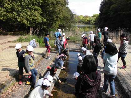 今日は近くの池の水や,そのまわりにいる生き物を調べに行きました。かめ・かえる・アメンボなどがいました。