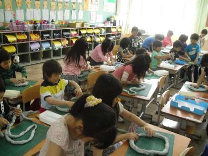 図画工作の学習で,ねんどをしました。最初は穴をあけて,「はい、チーズ。」をしていました。だんだん穴は大きくなり,首飾りになり,最後はへびになりました。指の力を思い切り使いました。