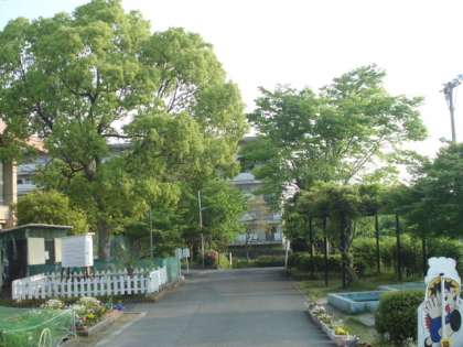 正門付近の木々の新緑が鮮やかです。新林校は多くの木々に覆われています。ご来校の折にご覧ください。