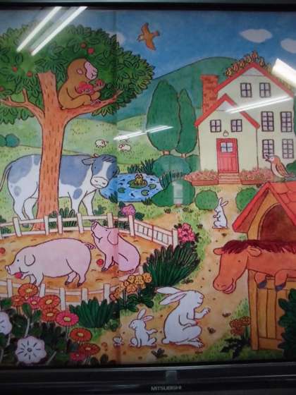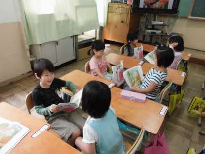 教科書の挿絵を見て,どんな動物がどこにいるのかを二人組で話し合いました。「なにがいますか?」に対して「ぶた!」や「さるです!」ではなく「さるがいます。」と正しい言葉を意識して行いました。二人組で楽しく取り組む子どもたち。「どこにいますか?」の質問に対してもうまく答えていました。