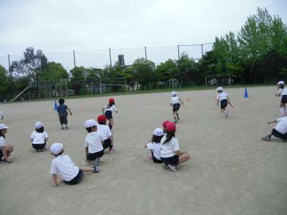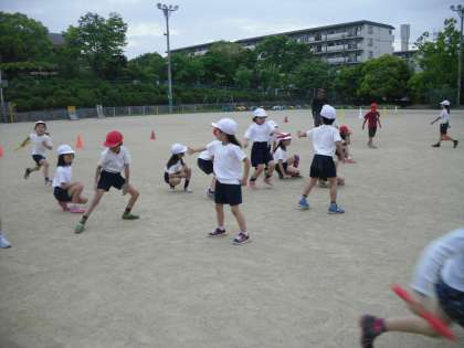 体育でリレー遊びをしました。バトン渡しに手間取るとどんどん遅れてしまいます。少しリードしながらバトンを確実にもらうことと,次の人にしっかり渡すことが大切だとわかりました。