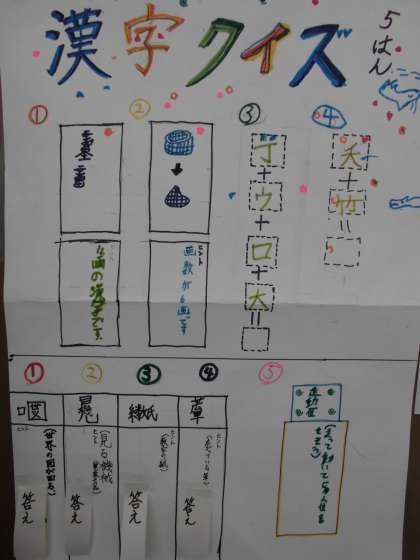 グループで,いろいろな漢字クイズを考えました。漢字絵解きクイズ,たし算やひき算クイズ,創作漢字クイズなどさまざまです。漢字辞典を使いながら,楽しく学習できました。