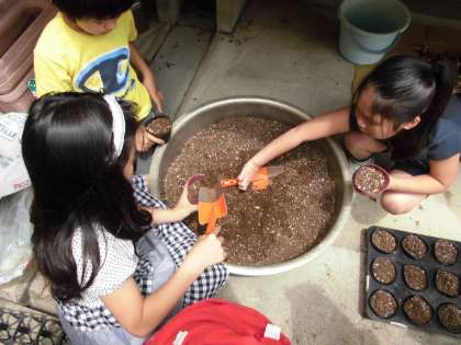 みんなでツルレイシの種を植えました。それぞれポットに入っている土に,指で穴をあけて,種を一粒入れいました。子どもたちのように,すくすくと育ってほしいです。