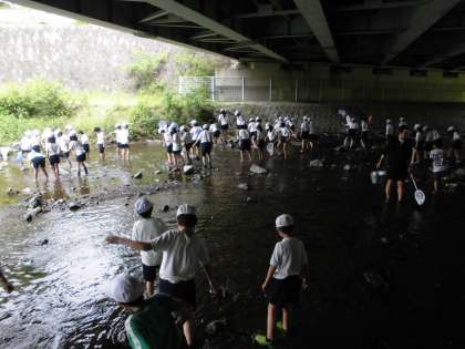 学年で小畑川へ行きました。そこで,水の中に住む生き物について調べました。水の中に足を入れると,子どもたちは嬉しそうにしていました。