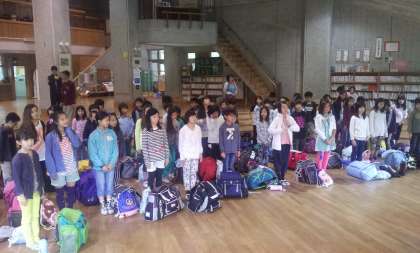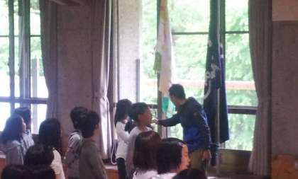 山の家に着きました。天気は曇りで気温は14度です。今、入所式をしています。