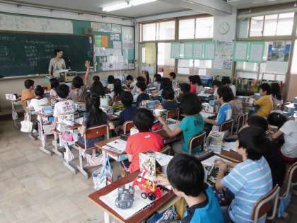 「電気のはたらき」の学習をしています。教室で直列つなぎ・並列つなぎや,電池の復習をしました。それから,光電池を使ってモーターを動かして,小さなプロペラを回しました。