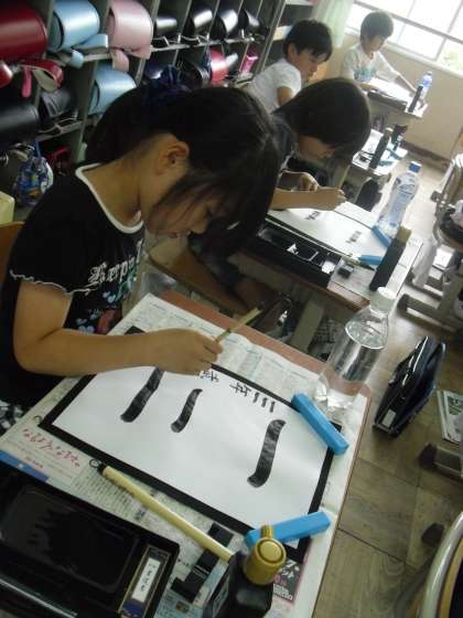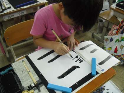 前回の学習の準備の仕方を思い出し、まずはじめに準備を自分の力だけでがんばりました。よく覚えていました。今日は横画の筆使いの勉強をしました。力の入れ方(筆圧)と線の太さを練習したあと、「とん!」「すうっ」「とん!」「ぱっ」のリズムに合わせて「一・二」を書いてみました。はじめて細筆を使って名前も書きました。最後に清書をして、今日の自分の一番を選びました。みんな集中して最後まで一生懸命書いていました!