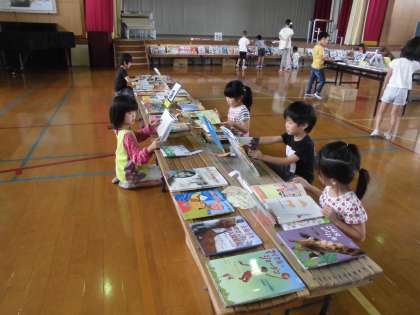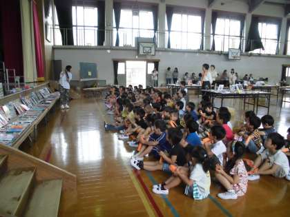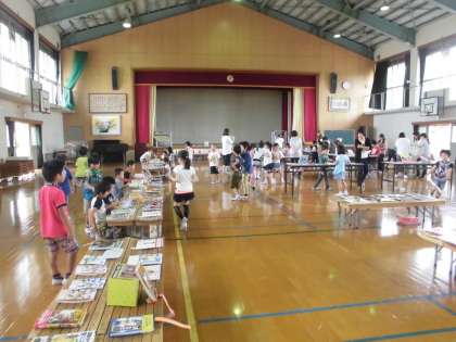 たくさんの本が並ぶ選書会。教室で選書会の約束をした後体育館へ行きました。たくさんの本の中から図書室に入れてほしい2冊を選びました。なかなか決められませんでしたが,最後には選んだ本に自分の短冊を入れていました。帰りの会では『選書会楽しかった。』という声も聞こえてきました。