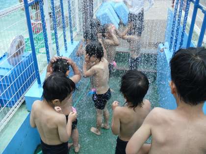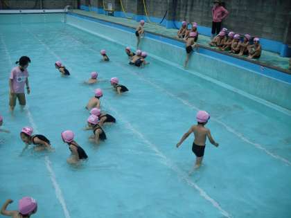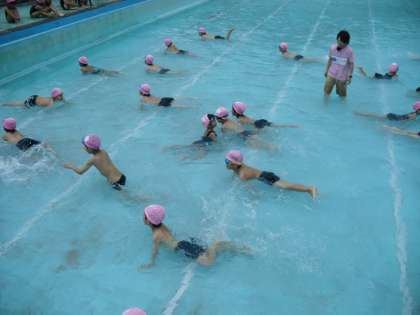 1年生2回目のプール学習です。子どもたち大きなプールにもすぐに慣れ,楽しく学習しました。小さくなっての忍者歩き,足を伸ばしてのワニ歩き,前へジャンプするイルカとび等たくさん練習しました。月曜日から水が多くなります。水に顔をつけたり,もぐったりの練習をしていきます。プール学習がある日は暑くなるといいですね。