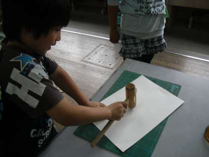 理科の学習で,じゃがいもの葉のでんぷんを調べました。日光に当てた葉と日光に当てなかった葉について,ろ紙に叩きつけてからヨウ素液で調べました。慎重に作業を進めて熱心に実験をしていました。