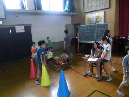 たてわりグループで協力してお店でお客さんを迎えたり,お店をまわったりしていました。楽しいサマーフェスタになりました。