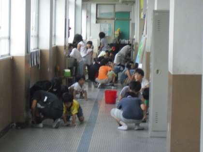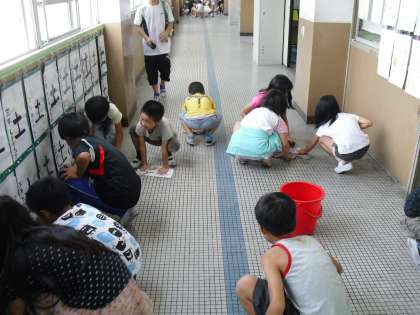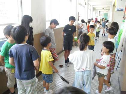 今日の掃除は『たてわり掃除』でした。1年生も高学年のお兄さん,お姉さんに交じってしっかり廊下を拭いていました。掃除の後には感想を言い合いました。1年生も「頑張ってやりました。」と言っていました。掃除上手な1年生でした。