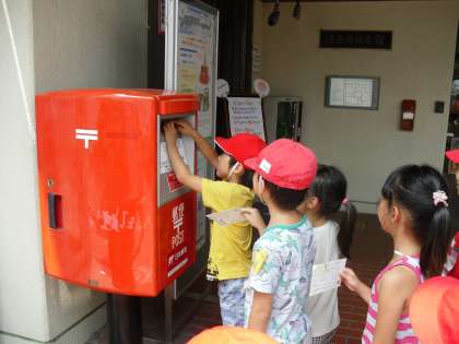 一人一枚ずつ書いたはがきを,ポストに入れに行きました。経験が少ないのか子どもたちはとても嬉しそうにポストに投函していました。帰りには「いつおばあちゃんの家に着くかな。」とか,「着いたら電話かかってくるかな。」など相手からの返事を楽しみにしていました。夏休みにはもう一枚はがきを渡します。この経験を生かして,はがきを書いて下さい。