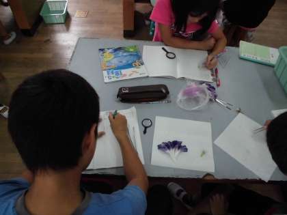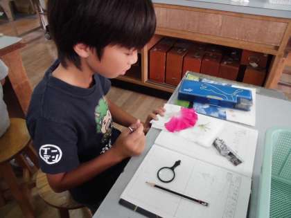花びらを切り開いて、アサガオの花のつくりを調べました。4年生で学習したツルレイシとはちがって、1つの花の中にめしべとおしべがあることがわかりました。そして、めしべとおしべをよく見比べると、数や形、どこについているかなどのちがいがわかりました。