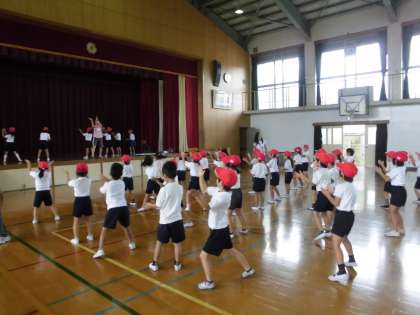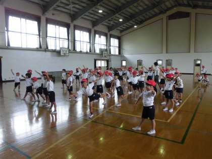 運動会に向けて,学年のダンスを練習しています。リズムにのって,たのしく踊っています。最後のポーズも練習中です。