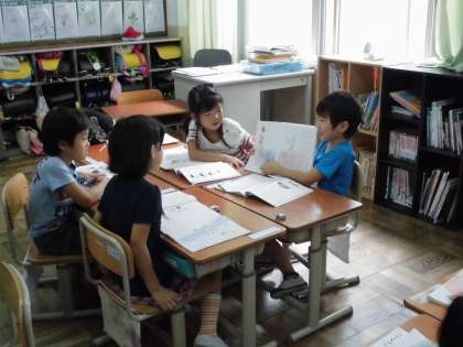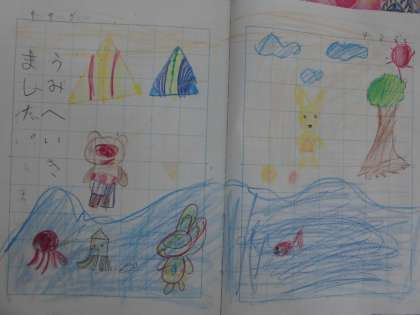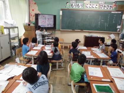 今日の国語は「ゆうだち」のお話の続きを発表しました。たぬきとうさぎが仲直りのあと,どこに行き何をしたのでしょう?自分で考えたお話を一生懸命絵にかき,グループごとに説明しました。その後,みんなの前で「ぜひ!」という友達の発表も。「うわー!」「すごーい!」「なるほどー!」と歓声があがりました。