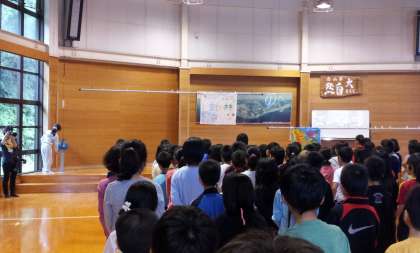 ホールで朝の集いをしています。校歌を歌い、学校を紹介もしっかり発表しました。