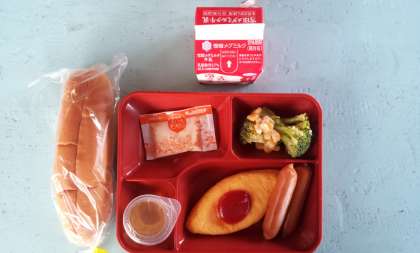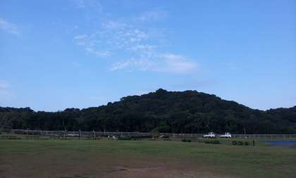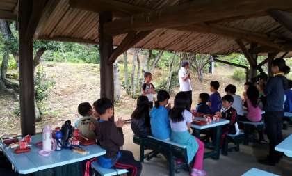 東屋で朝ごはんを食べました。子どもたちは元気です。天気も回復してきました。