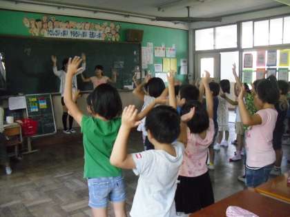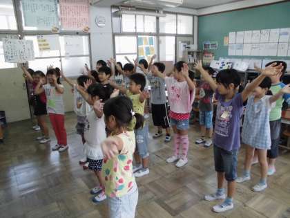 朝学習の時間に,ダンス係のお兄さんお姉さんが,全校ダンスの振り付けを教えに来てくれました。