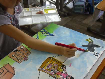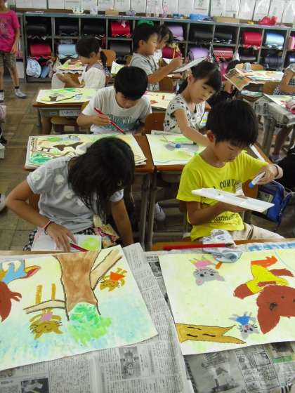 先週から2年生は「ぐーぐーぺこぺこ」と「とびばこのひるやすみ」と「トーラとパパの夏休み」というお話の中から1つ選んでお話の絵を描いています。お話を聞いて想像を膨らませ,楽しい絵を描いています。クレパスでしっかり塗ってきれいに仕上げている人や絵の具できれいな色を塗ってる人,仕上がりが楽しみです。