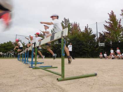 今日は初めての全校練習がありました。写真の1枚目は,全校ダンスの様子です。2枚目と3枚めは,学年体育のときにした,ハードル走やリレーの練習の様子です。