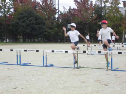 運動会でも走ったハードル走ですが,今回からは,2人で競い合う「対決!ハードル走」をしています。タイムが似た人同士で対決するので,ゴール前はかなり接戦になることも。お互いに競い合うことで,タイムもずいぶん縮まりそうです。