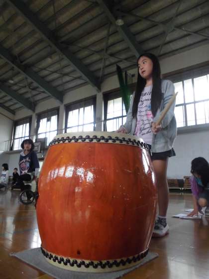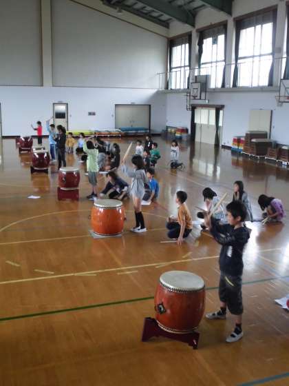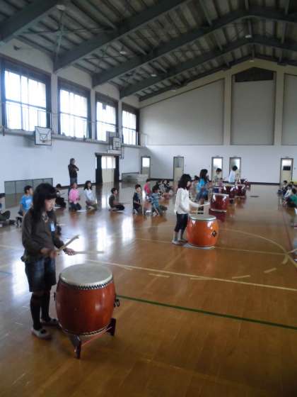 体育館で太鼓を6つ使って練習をしました。掛け声や太鼓の音が広がっていました。