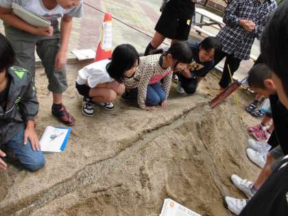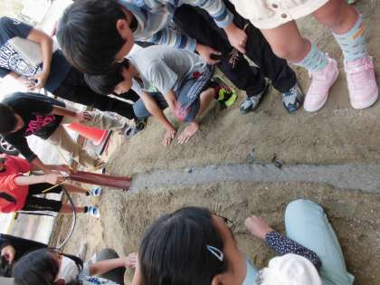 同じ川なのに、雨がふったあとでは様子が違う写真2枚を見比べました。そして、川の色や流れ、深さ、川幅などが違うことに気が付きました。では、何故このような違いがおこるのかを調べるために、どのような実験をすればよいかを班で考えました。いくつかの班の考えを整理して、実際に、砂場でやってみることにしました。水を流した時、川の様子はどのようになっているのかをじっくりと観察することができました。
