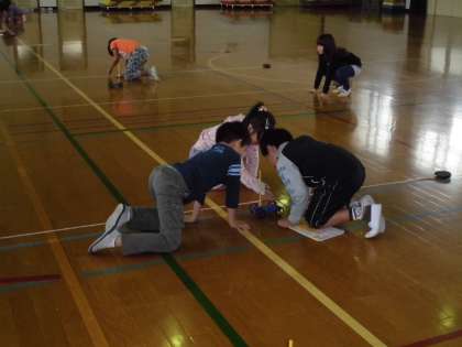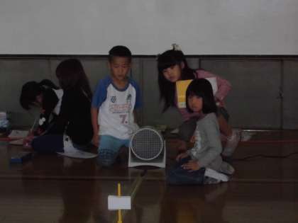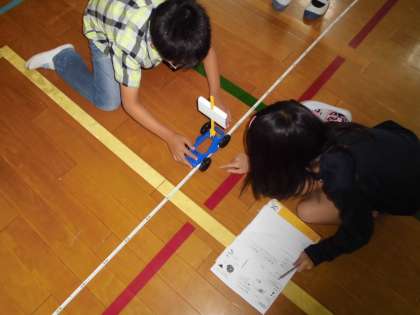 「車にあてる風の強さによって,車のうごき方がかわるのか?」ということを確かめるために,体育館に行って実験をしてみました。送風機を使って,弱い風と強い風をあてて車のうごき方を比べました。算数でも勉強している巻き尺を使ってそれぞれの距離をはかってみました。すると,風が強いと車が遠くまで走り,風が弱いと車は近くで止まることが分かりました。次の実験では,風をうける紙の形や大きさをかえたら,車のうごき方がどうなるのかを調べていきます。