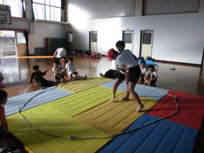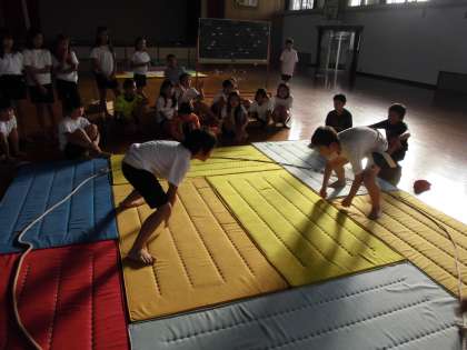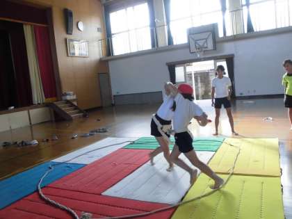 体育の時間にクラスで相撲大会を行いました。くじ運も左右するトーナメント方式です。まわしを取ることも,ぶつかることにも慣れていない子どもたち。「どうした?」と思うくらい早くに勝負が決まってしまうものもありました。しかし,進むにつれて,番狂わせあり,組み合っての好勝負あり,男子の部,女子の部とも見ていてなかなか楽しいものでした。また機会があれば,みんなで相撲を楽しみたいと思います。