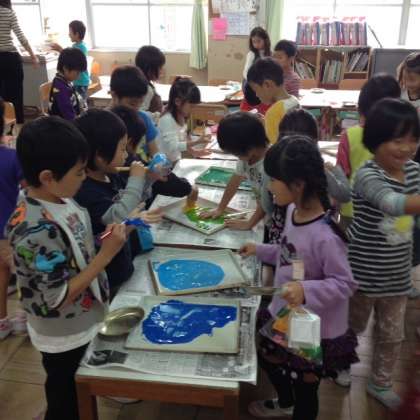 お家から持ってきたもの(型どりできるもの)に絵具をぬり,模造紙にスタンプのようにぺたぺた押して型をとって遊びました。スポンジや洗濯ばさみ,段ボールのギザギザの型などいろいろな型をとっていました。つなげると,カニになったり,カエルの顔ができたりして楽しんでいました。次回は,一人一人の作品を作るために画用紙で型をとります。
