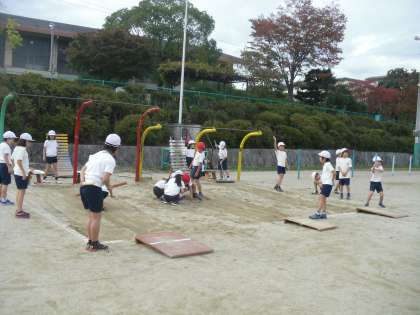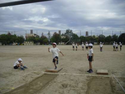 はばとびの学習では,はかり係・すなならし係・記ろく係・合図係・準備係に役割を分担して,交代で記録を計測しています。記録を伸ばすために,助走・踏み切り・着地のポイントを意識して,頑張っているところです。今日は,片足踏み切りと, ひざを曲げて両足で着地できる人がたくさん増えて,よかったです。準備・後片付けも早くできるようになってきましたね。