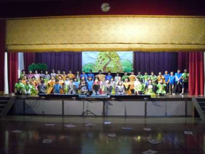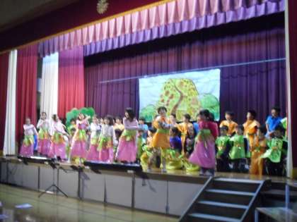 今日はリハーサルをしました。衣装も背景も本番通りに練習でき,いよいよ明日なんだと子どもたちもわくわくしています。学校でもお家でもたくさん練習をして,短期間の中,よくがんばってきました。リハーサルがおわった後,みんなで集まると「きんちょうでセリフをまちがえてしまった」「歌の声が低くなってしまっていつものように歌えなかった」などの声がありました。セリフが早口になってしまった子が多く,緊張している様子がとても伝わってきました。そこで,みんなでゆっくり話すゲームをしました。セリフをゆ〜っくり言うゲームです。笑顔で楽しく練習ができました。最後にみんなでもう一度セリフの練習をしましたが,今までで一番上手に言えていました。「明日は今までで一番いい劇にする!」とみんなの気持ちも一つです。