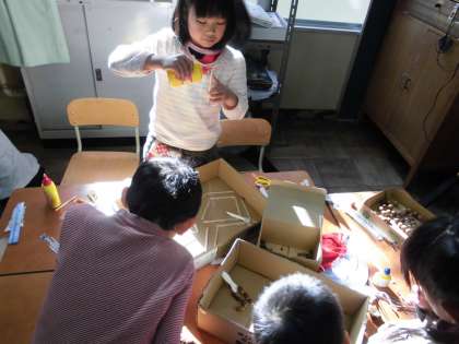 今日から「あきゲーム大会」に向けて,グループごとに準備が始まりました。こまを作って,回転具合を確かめるグループやわりばしやどんぐりを使って迷路の道を一生懸命作るグループがありました。いろいろな考えを出し合って準備に取り組んでいます。ゲーム大会の開催日が楽しみです。