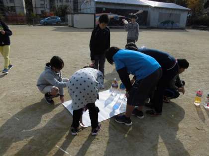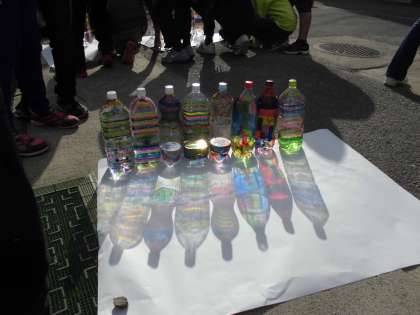 図工の学習でペットボトルに模様をつけ、太陽の光に当ててみました。