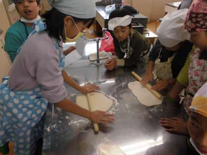 粉と水で生地をつくるところからはじめ、足で踏んでコシを出し、めん棒を使ってのばし、切ってゆでるまで、たくさんの作業を協力して行うことができました。