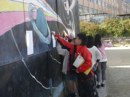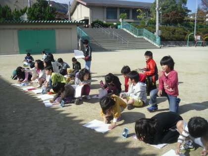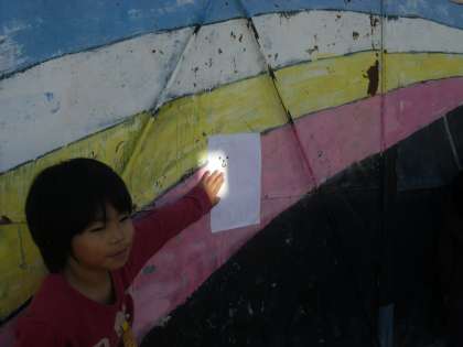 太陽の光を日かげにおいたまとに当てて,光をあてたところの明るさとあたたかさを調べる実験をしました。見たりさわったりしながら,かがみで太陽の光を当てたところは「明るくなって,少しあたたかい」ことを感じていました。
