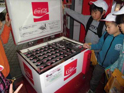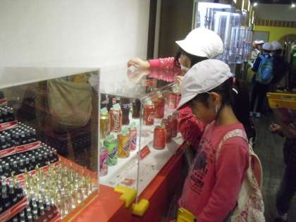 びんや缶やペットボトルにコカ・コーラを入れ,ケースに入れて工場を出るまで,すべて最新の機械によって作られていました。水処理装置できれいな水をつくっているところや,シロップを調合しているところ,フタをしっかりとしているところ,決められた量まで飲み物がはいっているかチェックをして,つぎつぎに出来上がっていくところなど,丁寧な説明をしていただきながら,見学することができました。コーヒーの缶がつぎつぎに運ばれている様子も見ることができました。製造風景の撮影はNGだったので,またどんな様子だったかお家でもお話を聞いてあげてください。そしてその後,展示広場で自動販売機や容器の工夫,リサイクルについてなどを見て回りました。