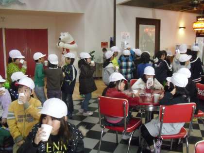 さいごに,みんなでコカ・コーラ社がつくっている飲み物を飲ませてもらいました。おなかを壊さないように気をつけながら,3〜4回列に並んで違う種類の飲み物を飲んでいる人もいました。一回をゆっくり味わって飲んでいる人もいました。実際に飲み物も飲めて,大満足の様子でした。とても充実した楽しい社会見学でした。