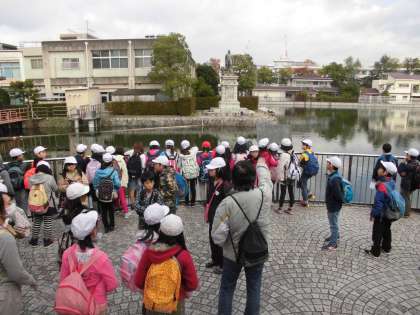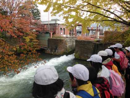 夷川発電所での様子です。社会の時間に学習した,北垣國道さんの銅像がありました。