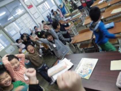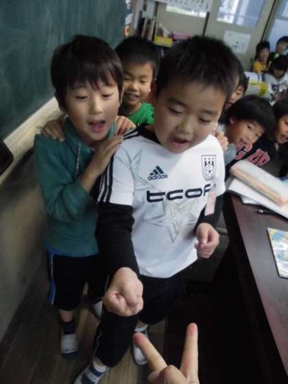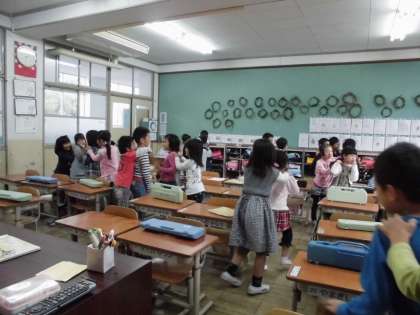 今日もけんばんハーモニカで「よろこびのうた」や「ひのまる」の練習をしました。指づかいやタンギングにもずいぶんと慣れた1年生。とっても上手に演奏することができるようになりました。歌も楽しく歌ったあとは,子どもたちの大好きな「かもつ列車」の時間です。多くの勝負を勝ち抜き,最後の決戦は,担任との勝負!しばらく負け続きの子どもたち。今日はいつも以上に気合十分でした。そして本日!2回戦目!ついに担任に勝利した子どもたち。クラス全員が大きな歓声をあげて喜びました。