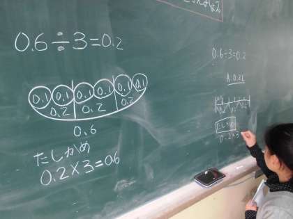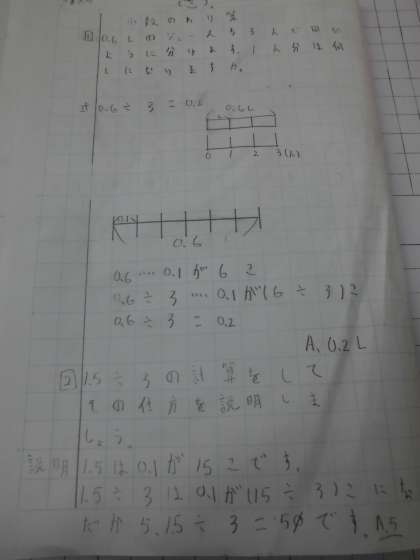 今日から小数のわり算です。小数×整数の計算の仕方を考えました。小数の計算は,前のかけ算のノートを見ながら考え,絵や線分図でも表すことができました。
