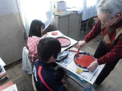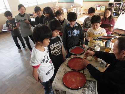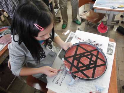 塗料を塗り,刷毛でなでました。そして,金・銀箔を蒔いてもらい,紙テープをめくって完成です。