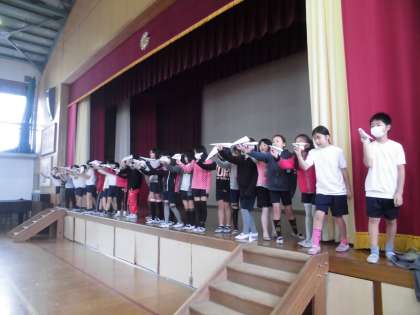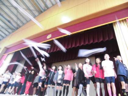 子どもたちが「紙飛行機飛ばし大会」を企画,運営してくれました。みんなそれぞれ工夫をこらした紙飛行機を作って飛ばしていました。男女,それぞれ上位3名に賞状が渡されました。